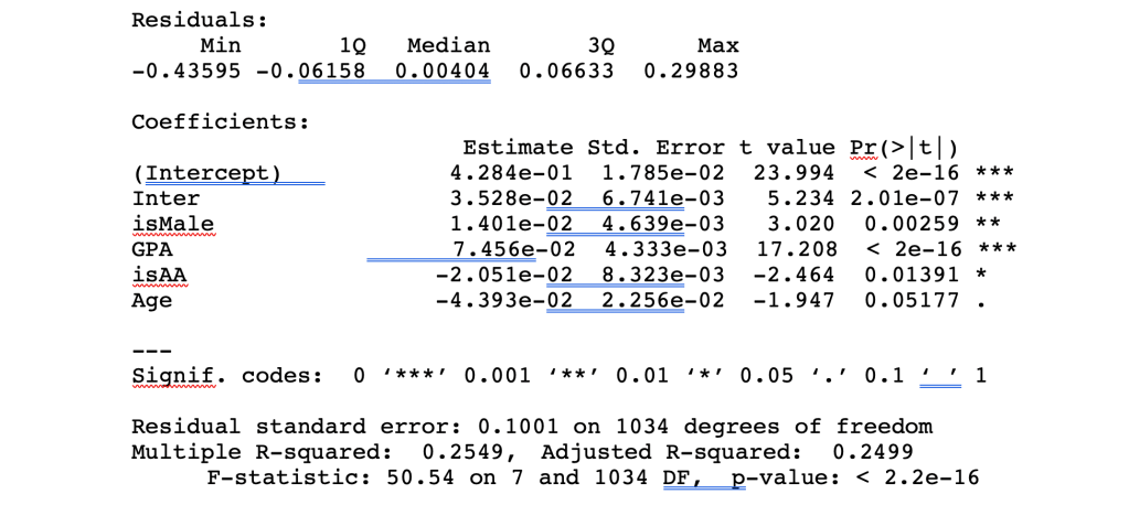 fit0 <- lm(CodedGrade ~ Inter+GPA+isMale+isAA+Age, data=mdata0, weights=weights)