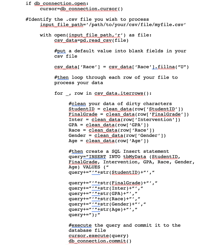 Once you have defined the data that you need, you will need to gather that data into one place to conduct your analysis. You have some options for getting your data from institutional sources, export from a learning management system, or manually collecting the data into a simple collection tool in Excel. This paper discusses importing from comma separated values files, but there may be other file formats you may encounter. MySQL itself has a way to import .csv and .xml files natively, though that tool may not be sufficiently flexible for processing your raw data. Python is a more flexible alternative for cleaning up and importing data into a database file, though a bit more patience may be needed to develop and test your code.