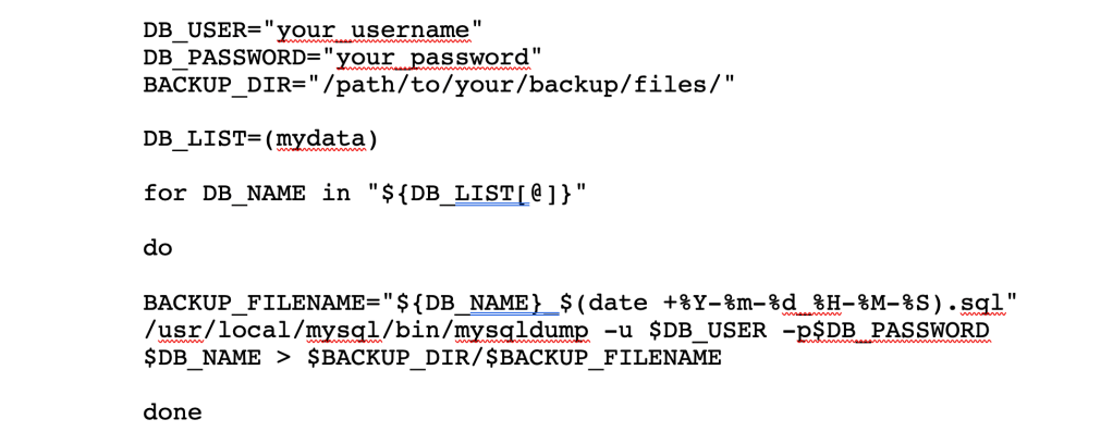 If you have created more than one database, you can add them in the DB_LIST variable separated by a comma, and the do loop will backup each one for you. Extra credit if you can find a way to schedule this script to run on a regular basis so you don’t have to think about backing up your data manually!